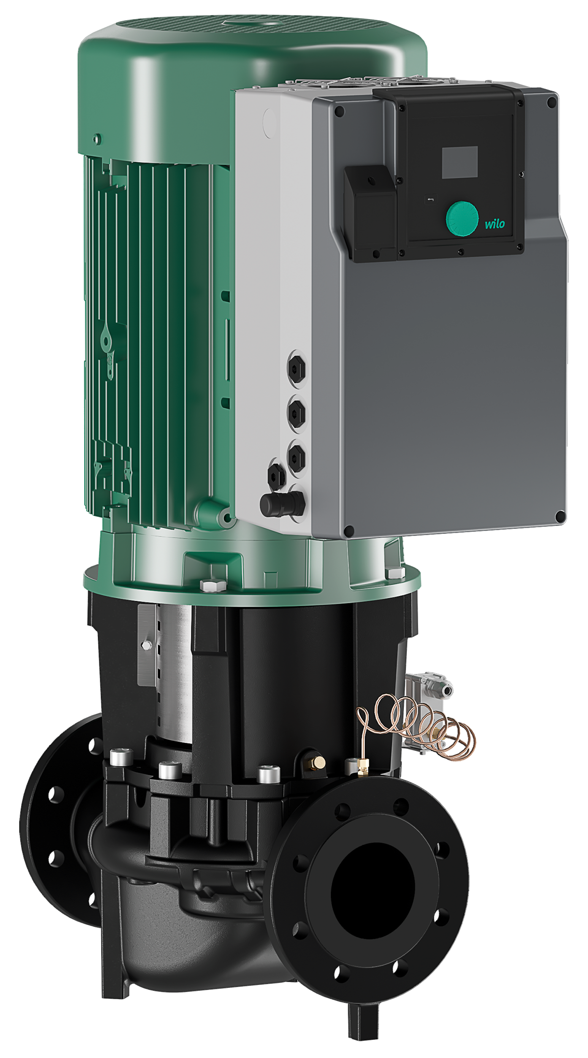 Elektronisk styret tørløberenkeltpumpe i inline-konstruktion med flangetilslutning og automatisk ydelsestilpasning.